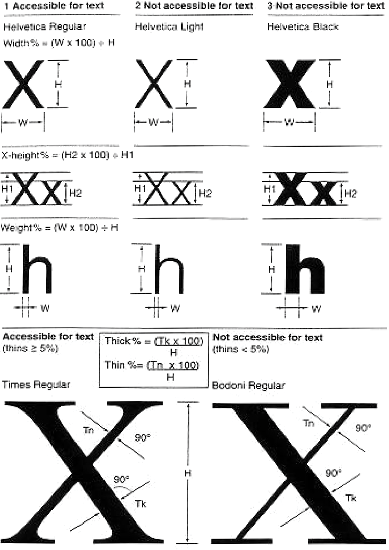 Andrzej Tomaszewski wymienia następujące elementy budowy liter jako znaczące dla czytelności i drukowności pisma: