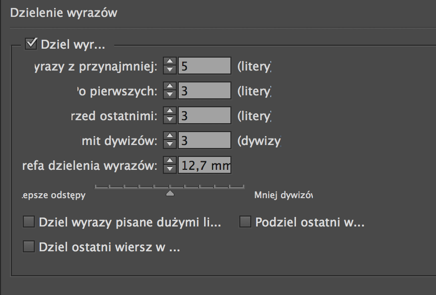 Uzyskanie poprawnie wyjustowanego tekstu bez dzielenia wyrazów nie jest możliwe. Należy jednak pamiętać, by odpowiednio ustawić parametry dzielenia: nie więcej, niż 3 dywizy w kolejnych linijkach, dzielenie zgodnie z językiem, w którym składamy tekst, unikanie dzielenia nazw własnych.