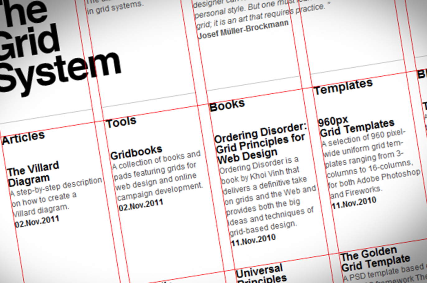 Podział płaszczyzny za pomocą przecinających się pionów, poziomów i skosów stanowi podstawę dla harmonijnego układu strony. Konsekwentne stosowanie siatki na kolejnych stronach publikacji pozwala zachować jej spójność, a element umieszczony wbrew zastosowanemu schematowi optycznie stanie się akcentem. Ponadto, przy obustronnym zadruku papieru o mniejszej gramaturze, pokrywające się pozycje wierszy rozwiążą problem prześwitywania tekstu na drugą stronę.