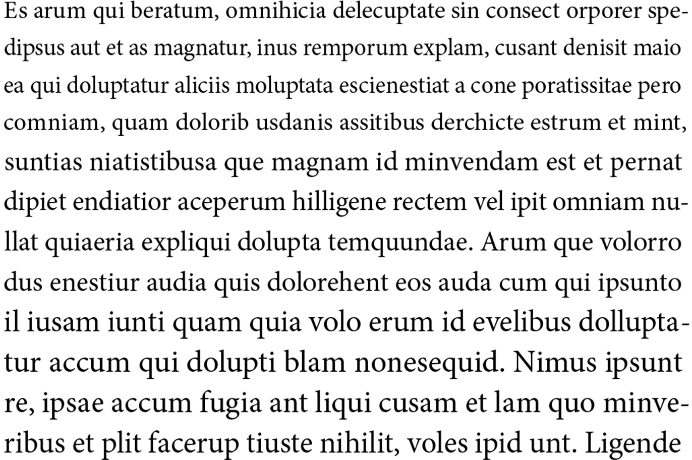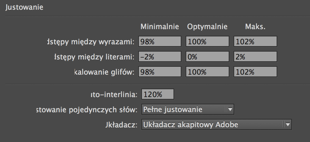 Ustawienia justowania – czyli odstępy między wyrazami i literami oraz skalowanie glifów. Należy starać się znaleźć kombinację, która będzie niewidoczna dla odbiorcy tekstu, pamiętając, że zauważalne zmiany zaczynają się już od 1,5% odchylenia od wartości wyjściowej. Po ustaleniu podstawowego stylu składu, opartego na optymalnych wartościach dla wybranego kroju i szerokości kolumny, warto zdefiniować styl ciaśniejszy i luźniejszy, pozwalające sformatować akapity, w których długość wyrazów utrudnia justowanie.
