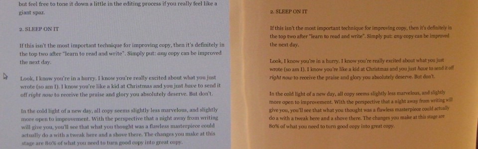 Czyli początek akapitu w ostatnim wierszu kolumny, oraz pojedynczy wyraz w pierwszym lub ostatnim wierszu kolumny, to często spotykane błędy w składzie tekstu ciągłego. Należy je eliminować przy użyciu twardych spacji, łączących pojedyncze słowa z resztą linijki. Jeżeli pozbycie się błędu jest wyjątkowo trudne, można spróbować zmienić parametry całego akapitu – zawsze należy jednak porównać jego szarość z resztą tekstu.